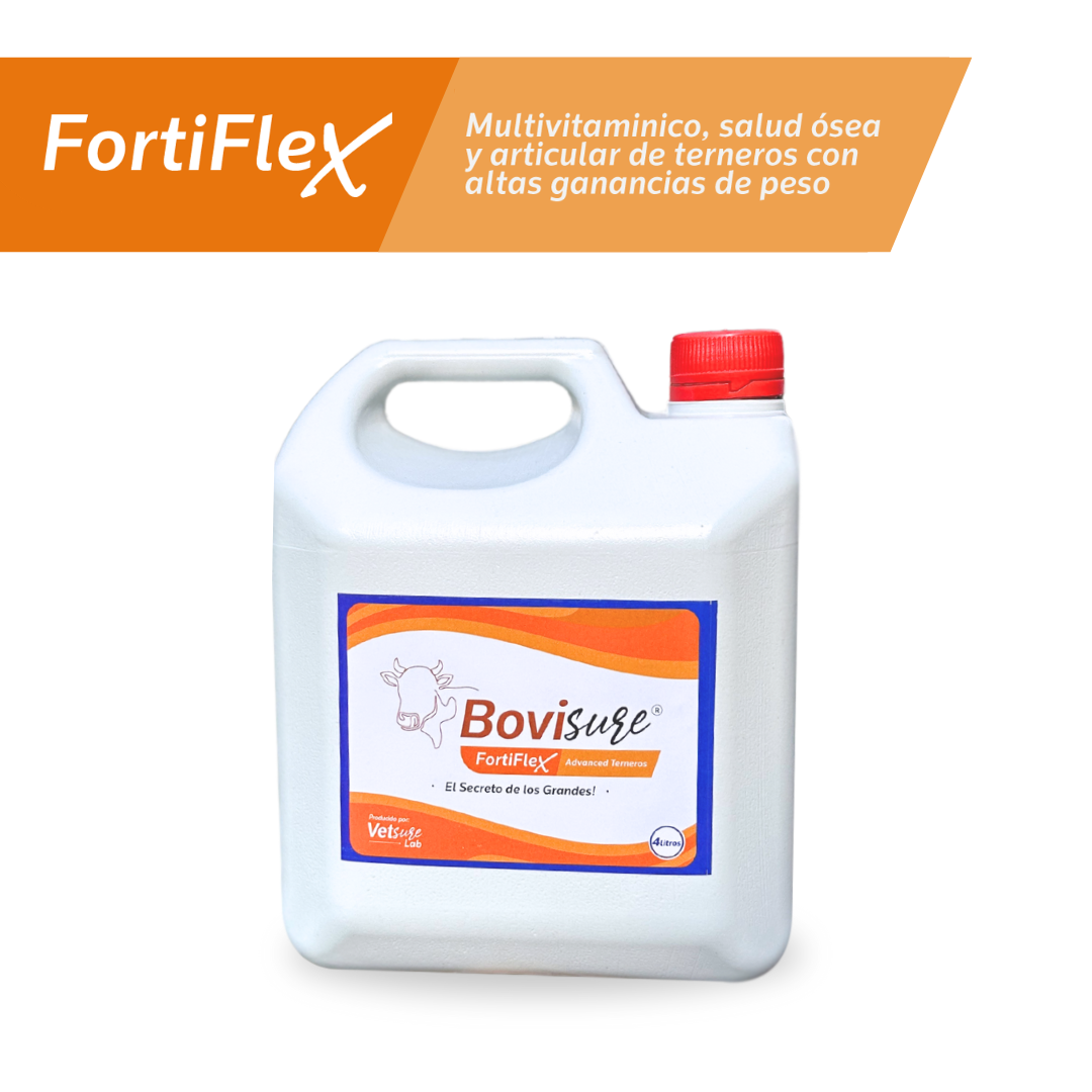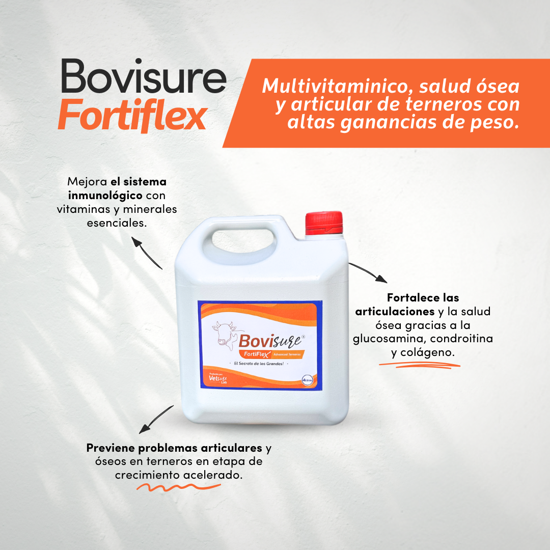 Bovisure Fortiflex es un suplemento multivitamínico específicamente formulado para terneros, enfocado en apoyar su sistema inmunológico, la salud de las articulaciones y los huesos durante su etapa de crecimiento. Incluye vitaminas, minerales y componentes como glucosamina, condroitan (probablemente condroitina) y colágeno, esenciales para su desarrollo.